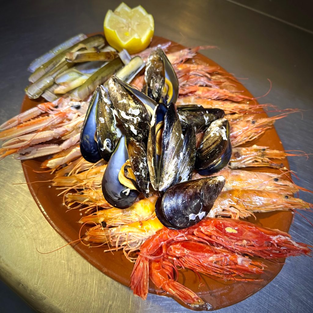Mariscada a la Plancha Un auténtico tesoro del mar, elaborado al momento y pensado para compartir entre dos. Pirata