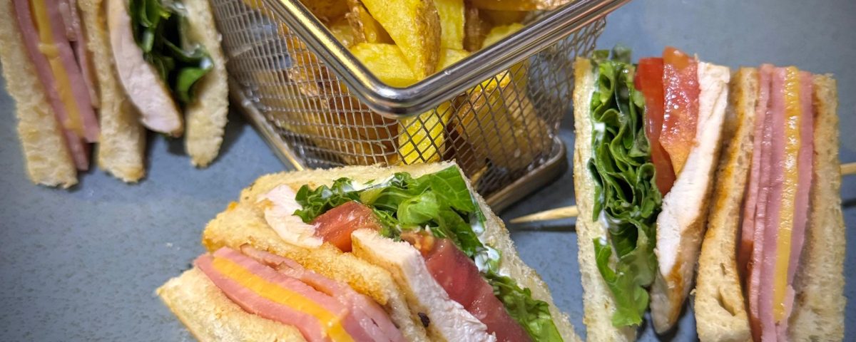 Tres pisos de pan tostado con pechuga de pollo, jamón York, queso cheddar, mayonesa, lechuga, tomate y bacon crujiente. Acompañado de patatas fritas.
