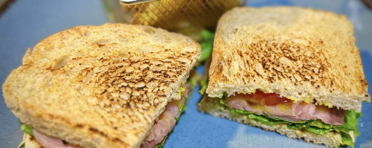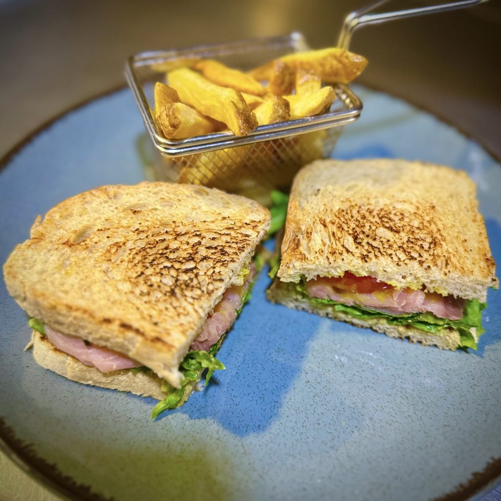 Tosta de pan crujiente con salmón ahumado, guacamole, tomate fresco y lechuga viva, aderezada con salsa de mostaza y miel. Acompañada de patatas fritas.