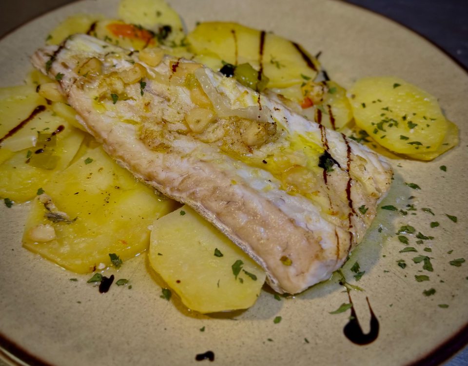 08/08/2025Lubina a la BilbaínaPreparada al estilo tradicional bilbaíno, con ajo dorado, guindilla y un toque de aceite de oliva virgen. Se acompaña de patatas panaderas.