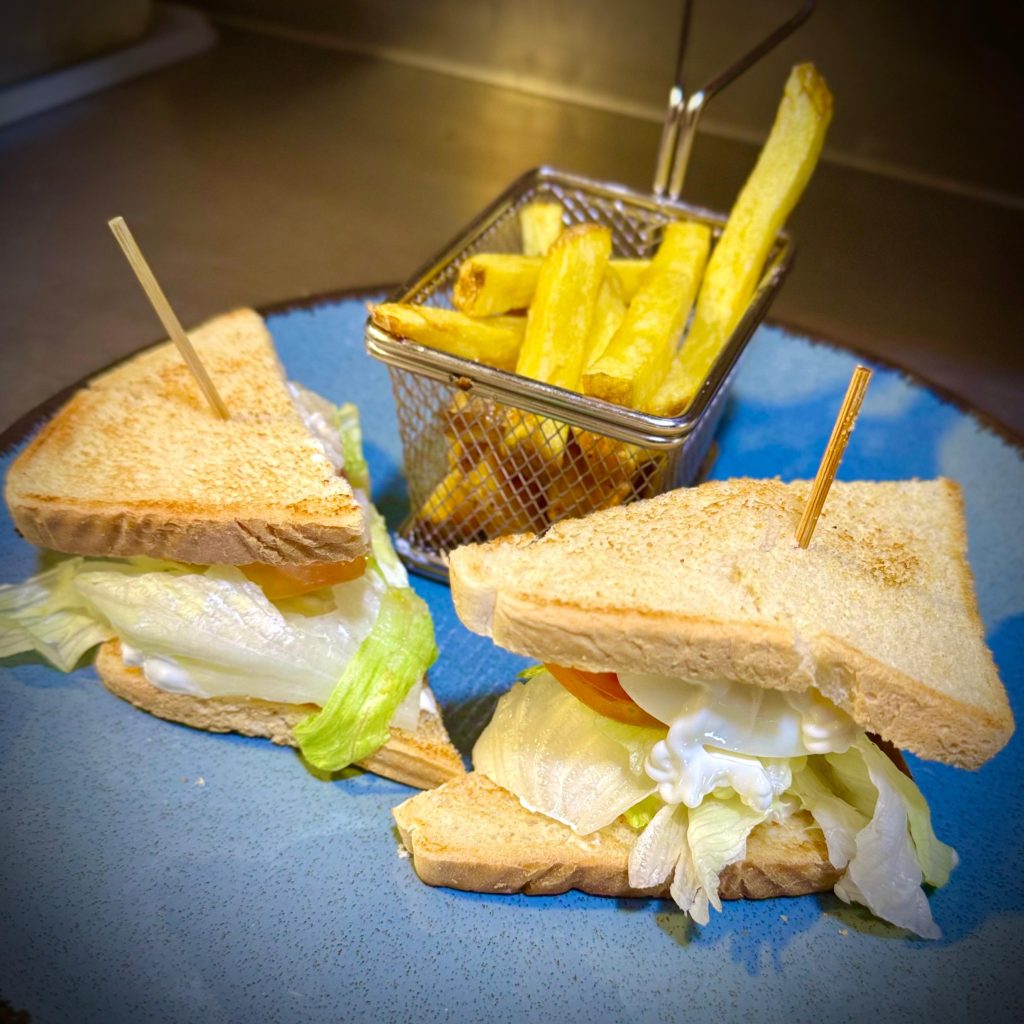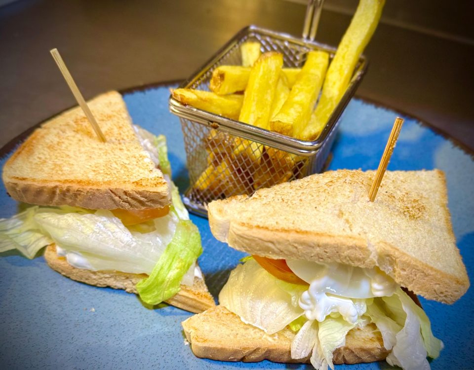 08/08/2025Sándwich VegetalSándwich vegetal con lechuga, tomate natural, espárragos, huevo cocido y mayonesa, elaborado con pan de molde tostado. Acompañado de patatas fritas.