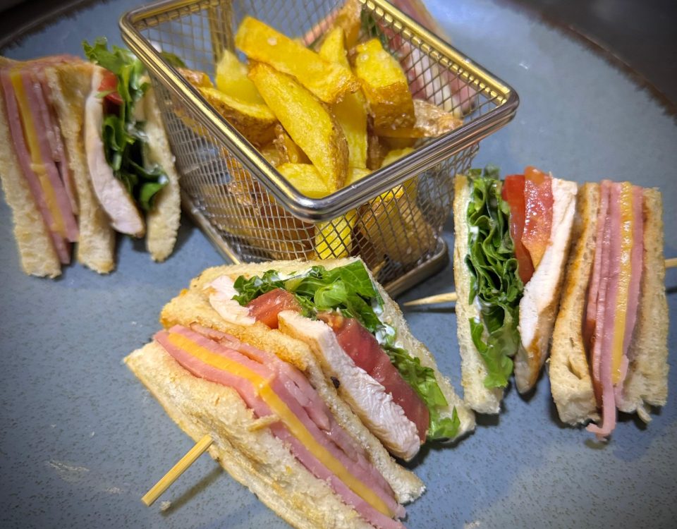 08/08/2025Sándwich Triple PirataTres pisos de pan tostado con pechuga de pollo, jamón York, queso cheddar, mayonesa, lechuga, tomate y bacon crujiente. Acompañado de patatas fritas.